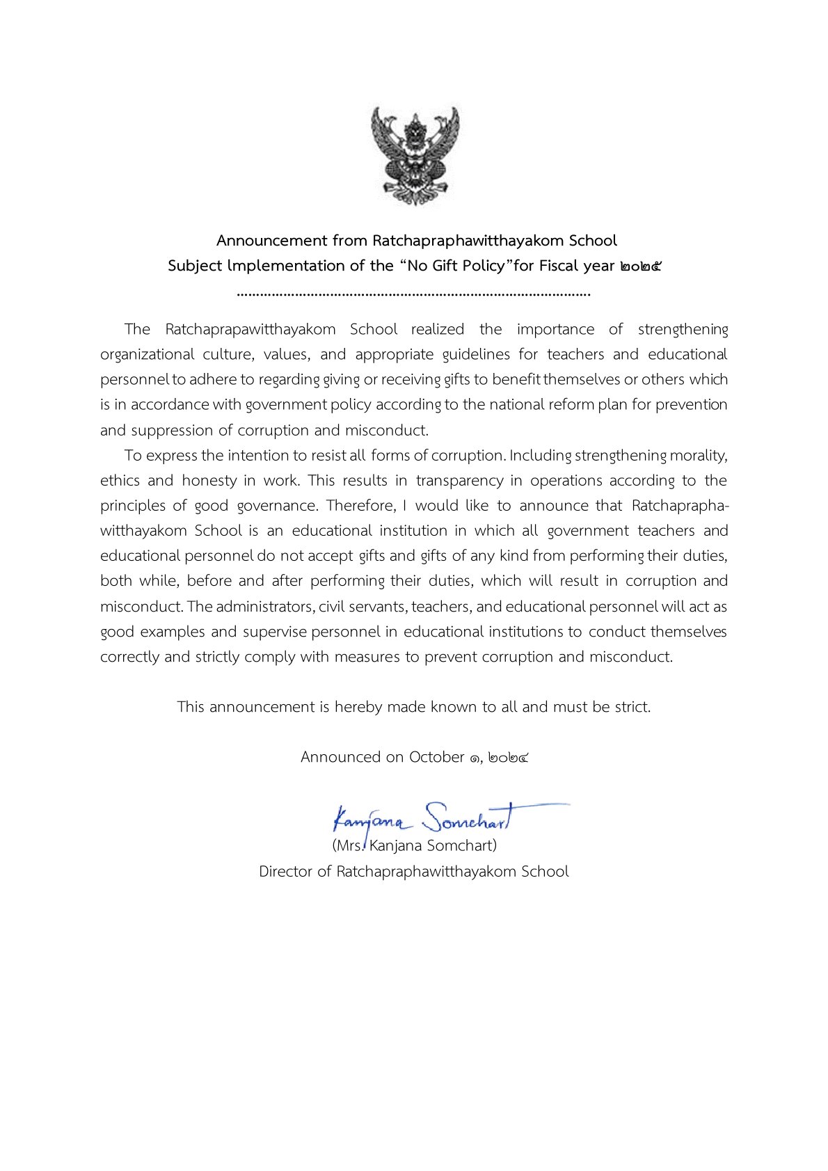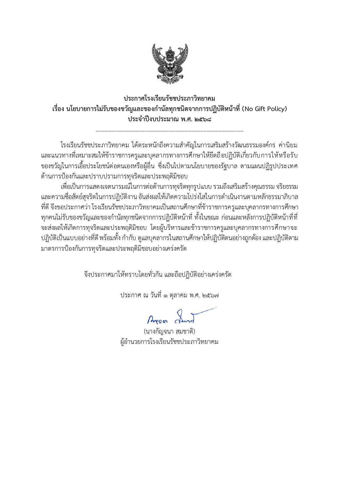 ประกาศเจตนารมณ์และการสร้างวัฒนธรรมตามนโยบาย No Gift Policy